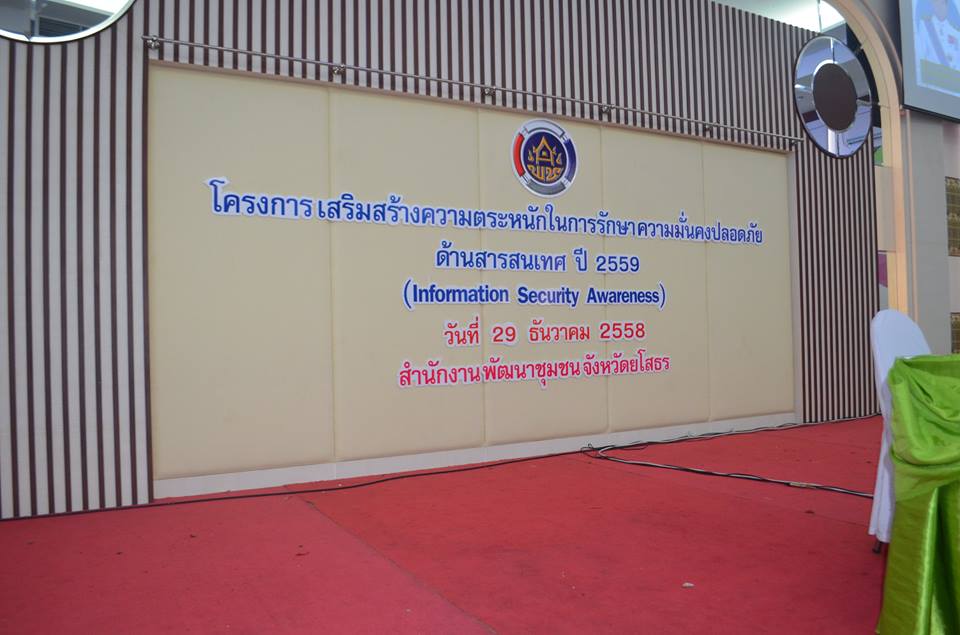 วันที่ 29 ธ.ค.58 เวลา 09.00 น. นายบุญธรรม เลิศสุขีเกษม ผวจ.ยโสธร ได้มอบหมายให้ นายดิเรก ธรรมฤทธิ์ พัฒนาการจังหวัดยโสธร เป็นประธานเปิดการฝึกอบรมโครงการเสริมสร้างความตระหนักในการรักษาความมั่นคงปลอดภัยด้านสารสนเทศ ปี 2559 (Information Security Awareness) ณ โรงแรมเดอะกรีนปาร์คแกรนด์ อ.เมืองยโสธร จ.ยโสธร กลุ่มเป้าหมายประกอบด้วยเจ้าหน้าที่พัฒนาชุมชนจังหวัด/อำเภอ ทุกอำเภอ รวมทั้งสิ้น 73 คนโดยมีวิทยากร จากบริษัท TOT ยโสธร และพัฒนาการจังหวัดได้สอดแทรกนโยบายท่านปลัดกระทรวงมหาดไทย เรื่อง มาตรการและสร้างจิตสำนึก การเสียชีวิตจากอุบัติเหตุการดืมสุรา ขับขี่รถยนต์หรือยานพาหนะ ให้กับ จนท.พช ด้วย