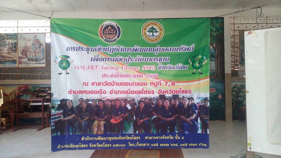 วันที่ 9 กุมภาพันธ์ 2559 นายดิเรก ธรรมฤทธิ์ มอบหมายให้กลุ่มงานส่งเสริมการพัฒนาชุมชน โดยนายปัญโญ สำรวมจิตร นักวิชาการพัฒนาชุมชนชำนาญการ ดำเนินกิจกรรมการประชุมเชิงปฏิบัติการพัฒนากลุ่มออมทรัพย์เพื่อการผลิตสู่ระดับมาตรฐาน (SMART Saving Group : SSG) จังหวัดยโสธร ณ ศาลาวัดบ้านดอนกลอง หมู่ 7,8 ต.หนองเรือ อ.เมืองยโสธร จ.ยโสธร
