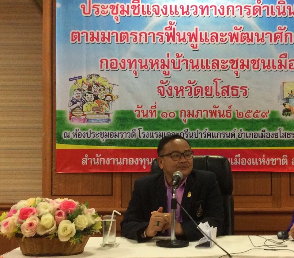 วันที่ 10 กพ. 59 เวลา 11.00 น. นายดิเรก ธรรมฤทธิ์ พัฒนาการจังหวัดยโสธร เป็นวิทยากรบรรยาย เรื่อง การพัฒนาศักยภาพกองทุนหมู่บ้านและมาตรการส่งเสริมความเป็นอยู่ระดับหมู่บ้านกองทุนละ 1 ล้านบาท แก่ จนท.พัฒนาชุมชน ,เครือข่ายกองทุนหมู่บ้านระดับจว.,คณะกรรมการกองทุนระดับหมู่บ้าน ณ รร.เดอะกรีนปาร์ค แกรนด์ อ.เมืองยโสธร จ.ยโสธร