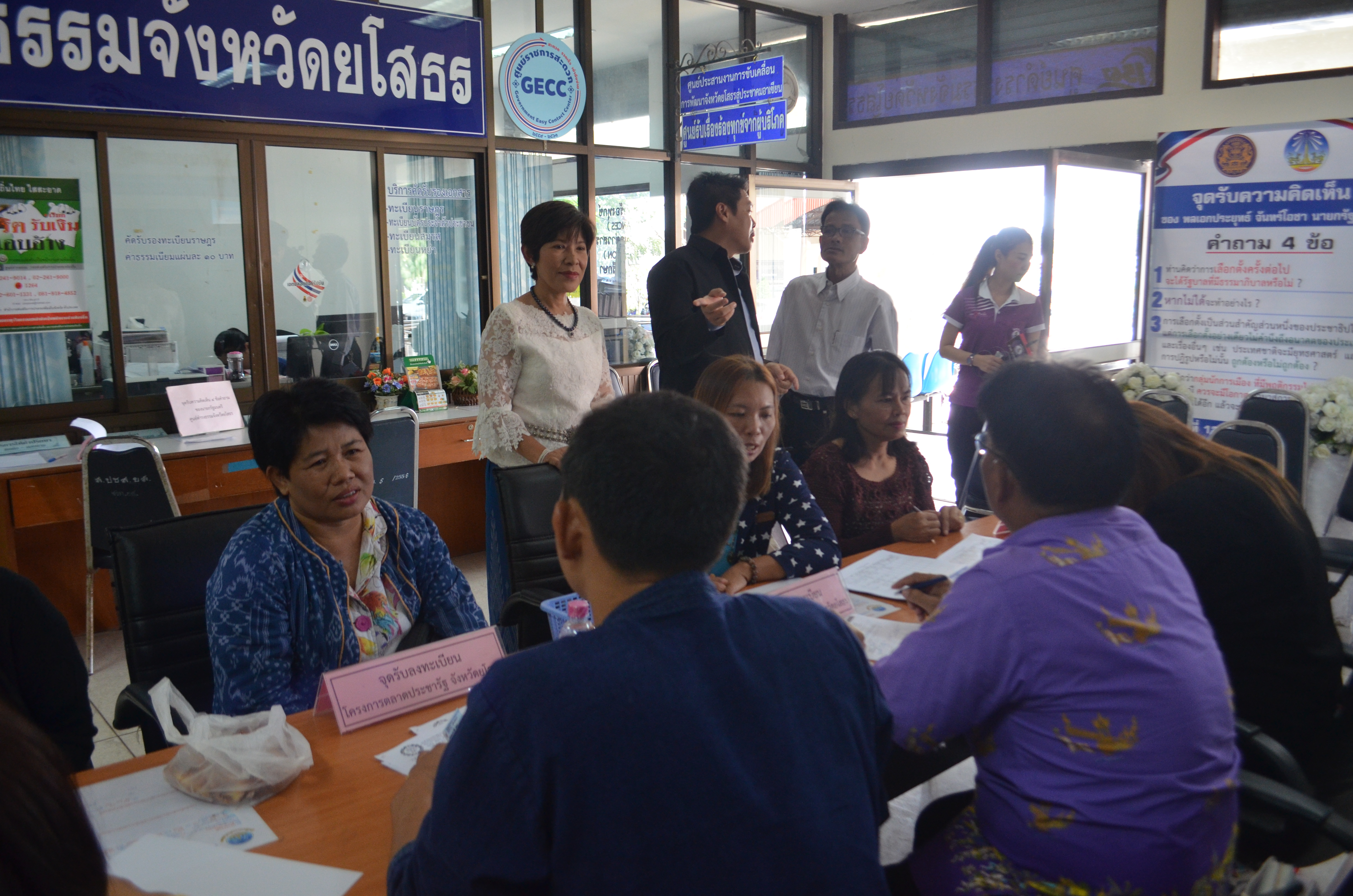 นางสาวชนมณัฐ รอดบุญธรรม พัฒนาการจังหวัดยโสธร พร้อมด้วยนายสมบัติ จงจินากูล หัวหน้ากลุ่มงานส่งเสริมการพัฒนาชุมชน สพจ.ยโสธร เจ้าหน้าที่พัฒนาชุมชน ให้คำแนะนำการลงทะเบียนตลาดประชารัฐ ณ จุดลงทะเบียนศาลากลางจังหวัด และทีมงานเจ้าหน้าที่พัฒนาชุมชนระดับอำเภอให้คำแนะนำ ณ จุดลงทะเบียนศูนย์ดำรงธรรมในระดับอำเภอ