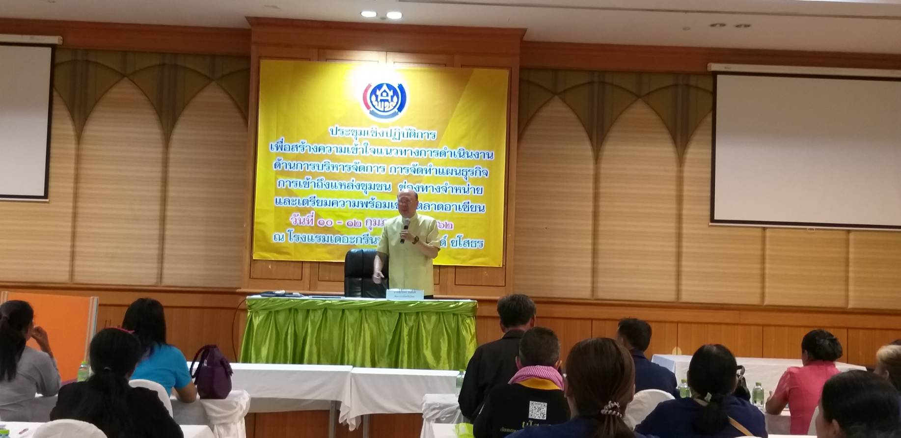 วันที่ 12 กุมภาพันธ์ 2562 เวลา 09.30 น. นายชัยโรจน์ ธนสันติ พัฒนาการจังหวัดยโสธร พบปะและมอบนโยบายแก่กลุ่มผู้ผลิต ผู้ประกอบการ OTOP ด้านการพัฒนาบรรจุภัณฑ์ และ Banner จำนวน 50 คน ตามโครงการประชุมเชิงปฏิบัติการเพื่อสร้างความเข้าใจแนวทางการดำเนินงานด้านการบริหารจัดการ การจัดทำแผนธุรกิจ การเข้าถึงแหล่งชุมชน ช่องทางจำหน่าย และเตรียมความพร้อมเข้าสู่ตลาดอาเซียน รุ่นที่ 2 ระหว่างวันที่ 11-12 กุมภาพันธ์ 2562 ณ โรงแรมเดอะกรีนปาร์คแกรนด์ยโสธร อำเภอเมืองยโสธร จังหวัดยโสธร