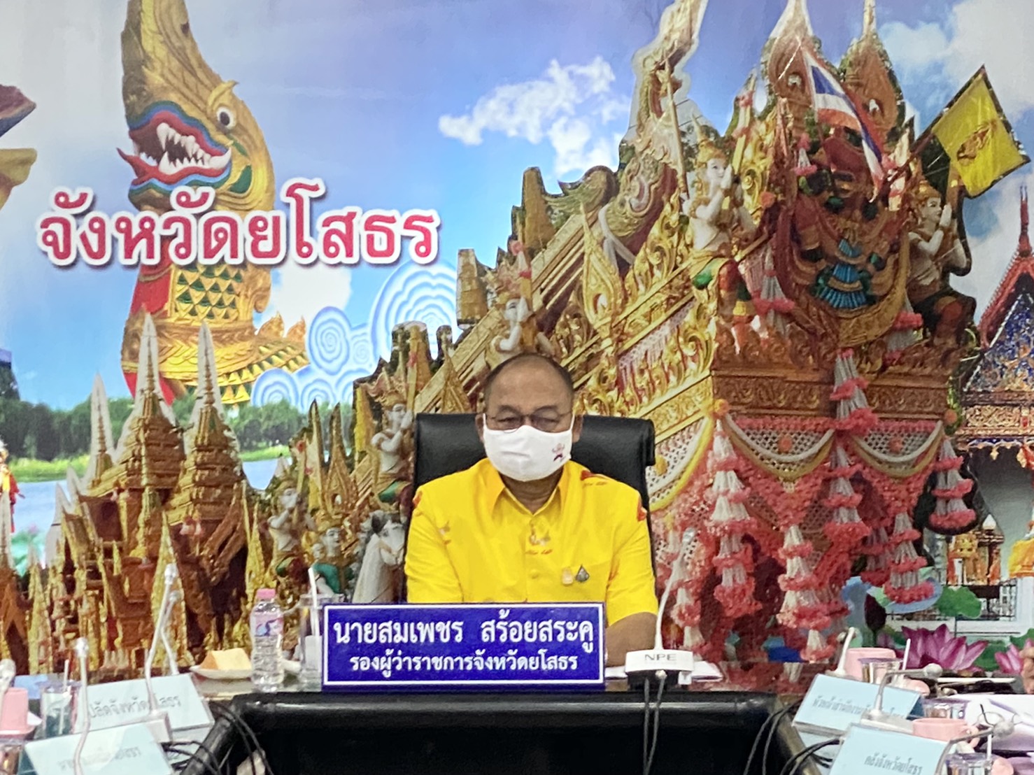 วันที่ 22 ตุลาคม 2563 เวลา 09.30 น. นายสมเพชร สร้อยสระคู รองผู้ว่าราชการจังหวัดยโสธร พร้อมด้วยหัวหน้าส่วนราชการ ผู้แทนหน่วยงานที่เกี่ยวข้อง ร่วมประชุมผ่านระบบวีดิทัศน์ทางไกล (Video Conference. System)ณ ห้องประชุมแตงโมหวาน ชั้น 2 ศาลากลางจังหวัดยโสธร เพื่อชี้แจงรายละเอียดโครงการคนละครึ่งฯ โดยมีพลเอกอนุพงษ์ เผ่าจินดา รัฐมนตรีว่าการกระทรวงมหาดไทย และนายอาคม เติมพิทยาไพสิฐ รัฐมนตรีว่าการกระทรวงการคลังเป็นประธานการประชุม