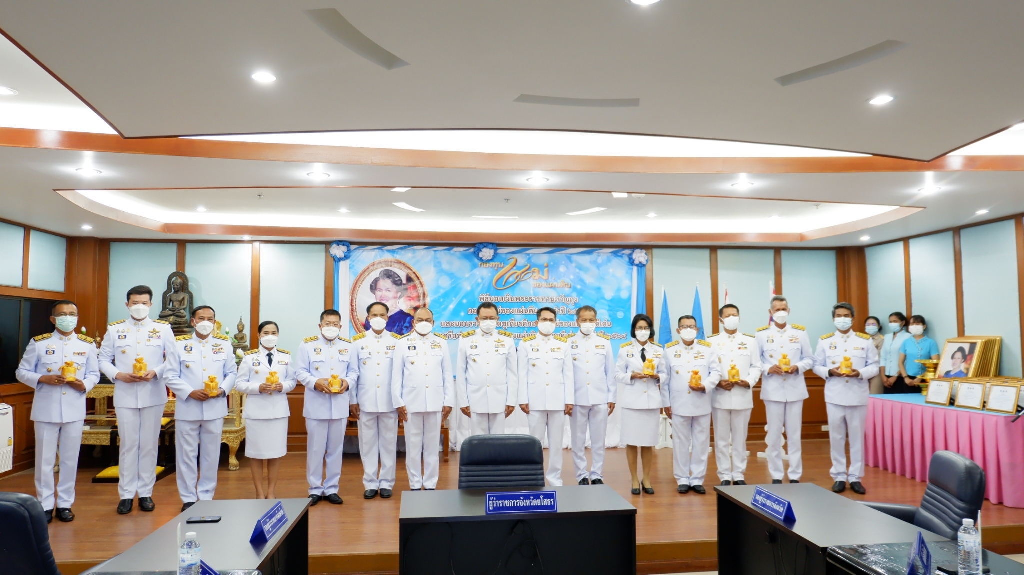 นายชลธี ยังตรง ผูวาราชการจังหวัดยโสธร พร้อมด้วยนายสมเพชร สร้อยสระคู รองผู้ว่าราชการจังหวัดยโสธร นายสุวัฒน์ เข็มเพชร รองผู้ว่าราชการจังหวัดยโสธร นายชัยวัฒน์ ชัยเวชพิสิฐ ปลัดจังหวัดยโสธร นายอำเภอ ทุกอำเภอ พัฒนาการอำเภอ ทุกอำเภอ มอบเงินพระราชทานขวัญถุงกองทุนแม่ของแผ่นดิน ประจําปี 2563 และมอบรางวัลเชิดชูเกียรติกองทุนแมของ แผนดินดีเดน และเครือขายกองทุนแมของแผนดินอําเภอ ดีเดน จังหวัดยโสธร ประจําป 2564 ณ ห้องประชุมข้าวหอมมะลิอินทรีย์ ชั้น 3 ศาลากลางจังหวัดยโสธร