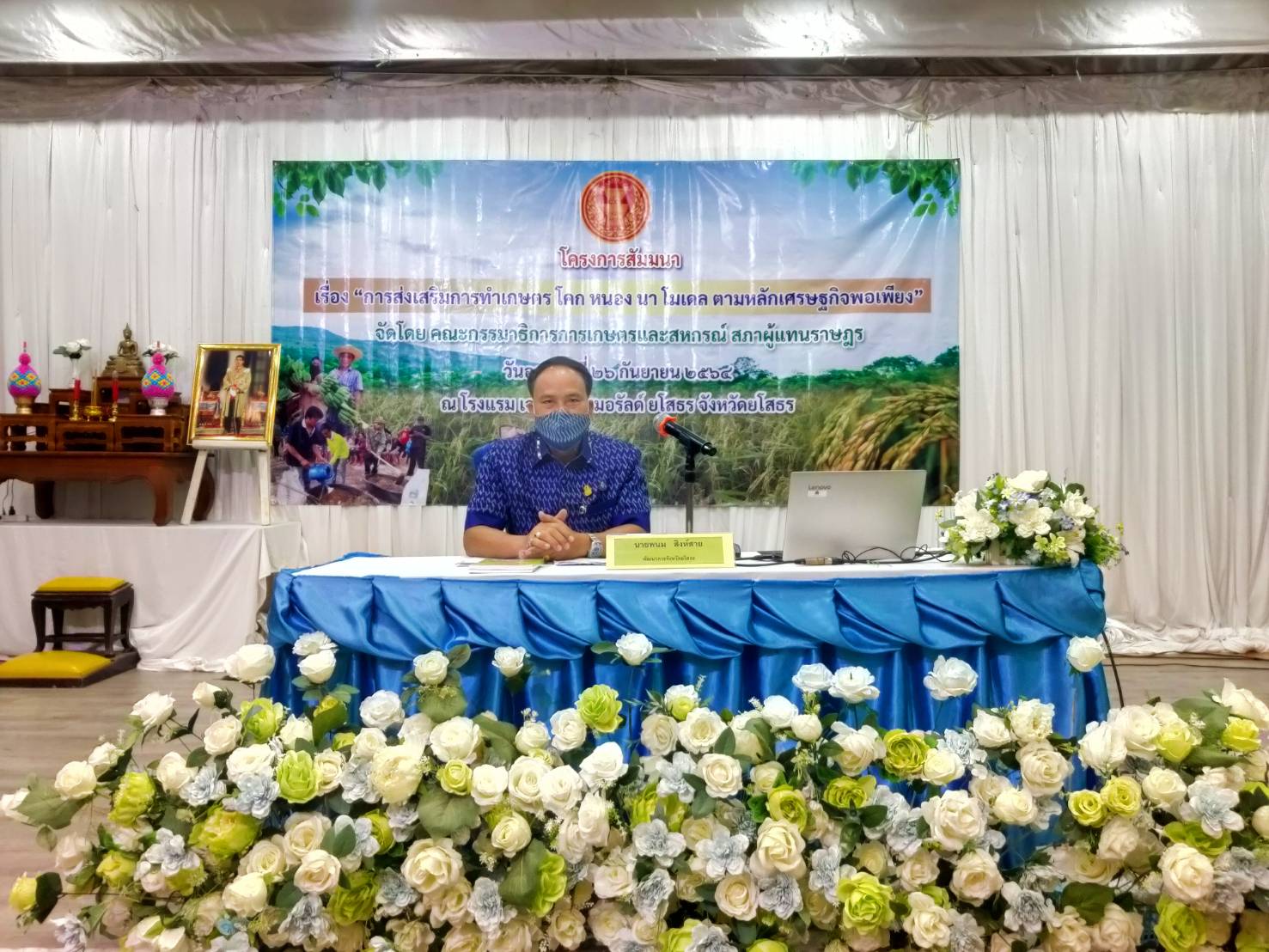 เรื่อง “การส่งเสริมการทำเกษตร โคก หนอง นา โมเดล ตามหลักเศรษฐกิจพอเพียง” โดยมีวัตถุประสงค์เพื่อสร้างความรู้ ความเข้าใจให้แก่เกษตรกรเกี่ยวกับการบริหารจัดพื้นที่ทำการเกษตรตามหลักโคก หนอง นา โมเดล เพื่อเกษตรกรสามารถนำไปปรับใช้ในการพัฒนาการทำการเกษตรในพื้นที่ได้อย่างมีประสิทธิภาพ เพิ่มประสิทธิผลทางการผลิต อีกทั้ง ร่วมแลกเปลี่ยนเรียนรู้ระหว่างผู้เข้าร่วมสัมมนากับวิทยากร พร้อมทั้ง คณะกรรมาธิการได้รับทราบข้อมูล ข้อเท็จจริง สภาพปัญหา อุปสรรคในการส่งเสริมการทำเกษตรตามแนวทาง “โคก หนอง นา โมเดล” ในพื้นที่จังหวัดยโสธร