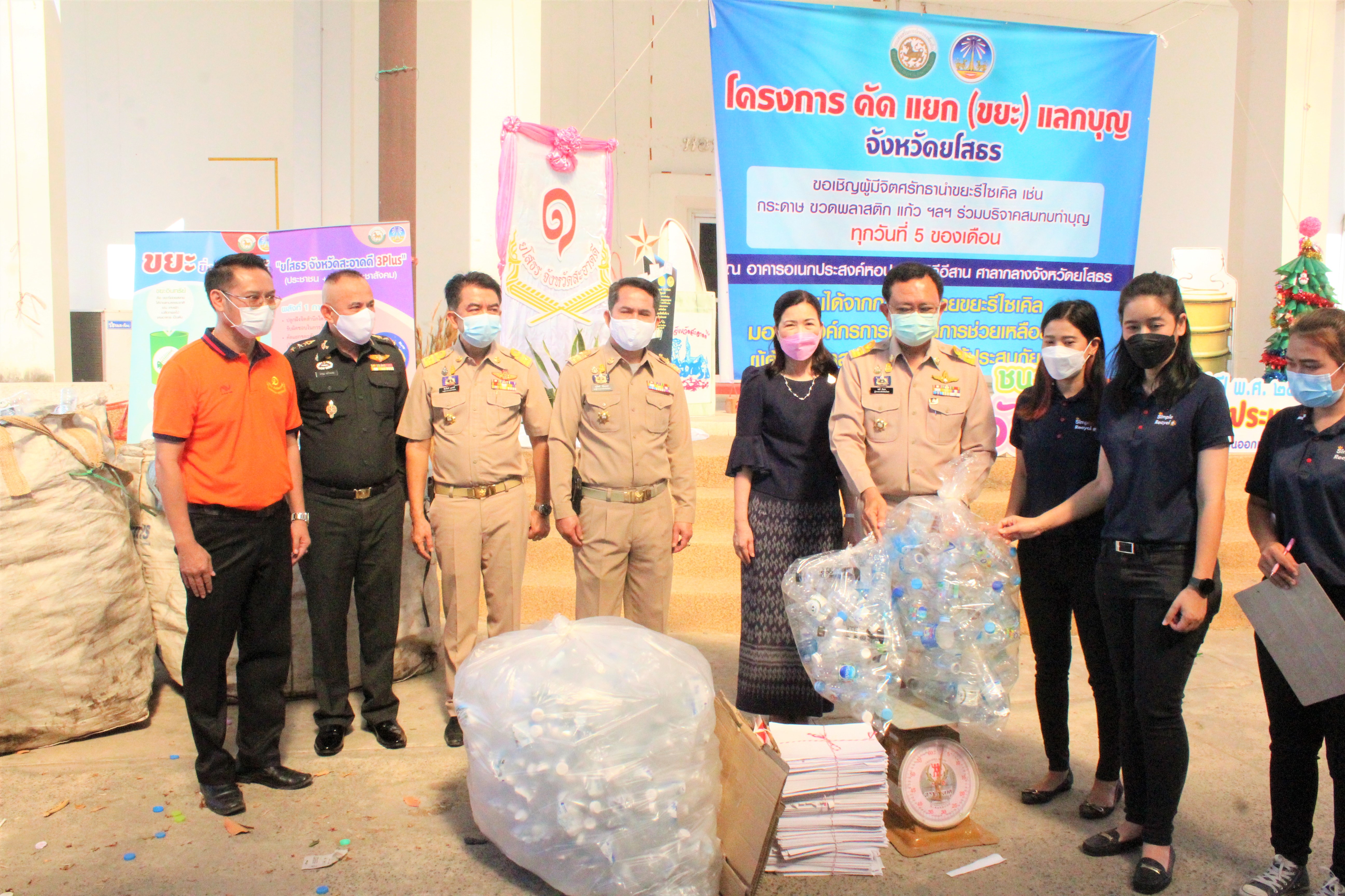 ?วันที่ 27 ธันวาคม 2564 เวลา 10.00 น. นายชลธี ยังตรงผู้ว่าราชการจังหวัดยโสธร ประธานกิจกรรม โครงการ “คัด แยก (ขยะ) แลกบุญ” Kick Off นำขยะรีไซเคิลมาร่วมบริจาคเพื่อจำหน่าย ตามโครงการ “คัด แยก(ขยะ) แลกบุญ” เพื่อเป็นการรักษามาตรฐานและต่อยอดจังหวัดสะอาดระดับประเทศอย่างยั่งยืน พร้อมขับเคลื่อนการบริหารจัดการขยะมูลฝอยชุมชนแบบบูรณาการร่วมกัน รวมทั้งเพื่อปลูกฝังจิตสำนึกให้ทุกคนจัดการขยะมูลฝอยด้วยตนเองโดยการเปลี่ยนขยะเป็นเงิน โดยมี นางพัทธานันท์ ยังตรง นายกเหล่ากาชาดจังหวัดยโสธร นายสุวัฒน์ เข็มเพชร นายชัยวัฒน์ แสงศรี รองผู้ว่าราชการจังหวัดยโสธร พร้อมทั้ง ปลัดจังหวัดยโสธร หัวหน้าส่วนราชการและข้าราชการพนักงาน ณ บริเวณหน้าหอประชุมวิถีอีสาน หน้าศาลากลางจังหวัดยโสธร(หลังเก่า)