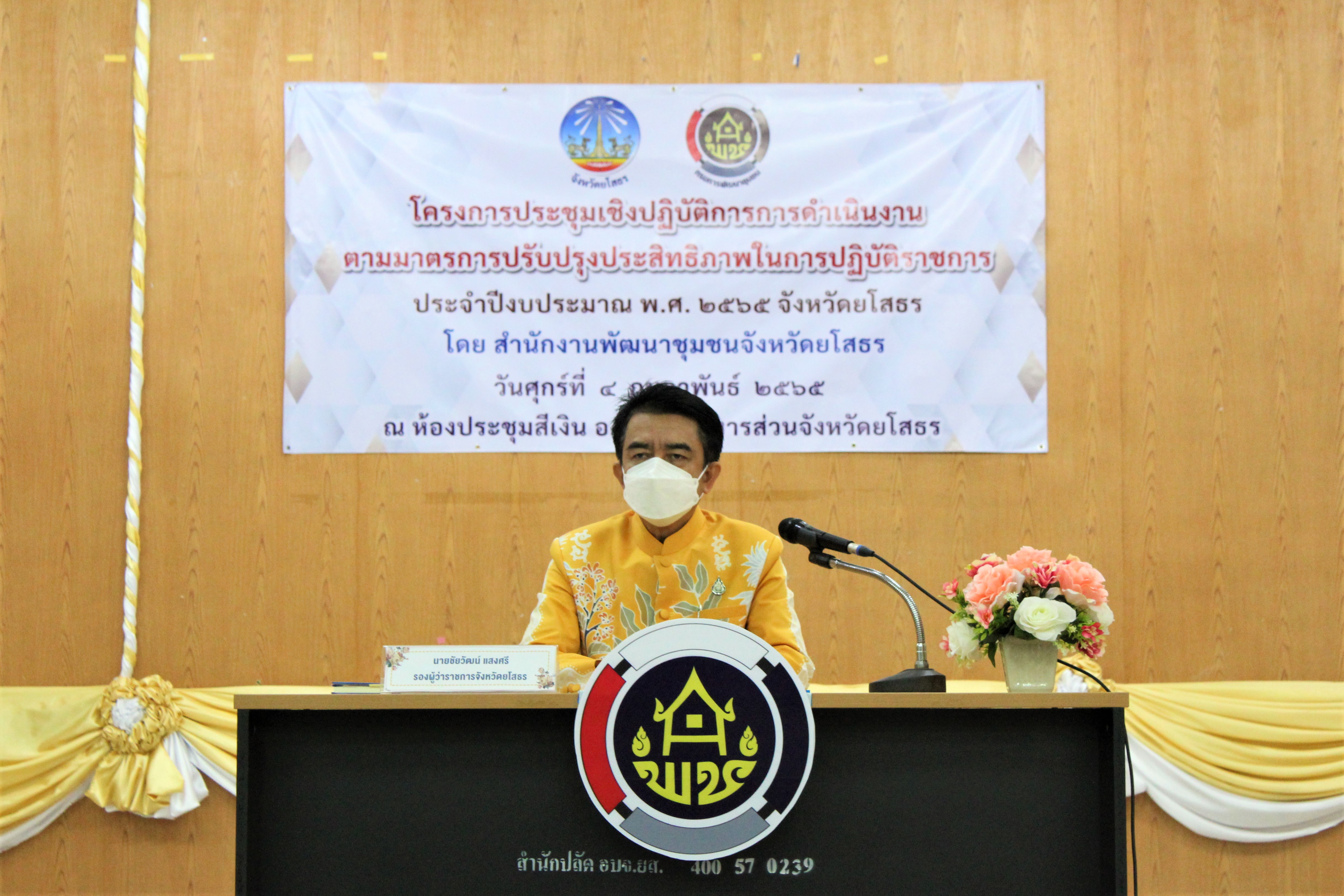 ? นายชลธี ยังตรง ผู้ว่าราชการจังหวัดยโสธร มอบหมายให้ นายชัยวัฒน์ แสงศรี รองผู้ว่าราชการจังหวัดยโสธร ยโสธร ประธานการประชุมเชิงปฏิบัติการการดำเนินงานตามมาตรการปรับปรุงประสิทธิภาพในการปฏิบัติราชการประจำปีงบประมาณ พ.ศ.2565 และพิธีลงนามบันทึกข้อตกลงการดำเนินงานตามตัวชี้วัดและค่าเป้าหมายการประเมินผลการปฏิบัติราชการ โดยมี นายสุรชัย แดนพิบูลย์ ผู้อำนวยการกลุ่มงานสารสนเทศฯ รักษาราชการแทนพัฒนาการจังหวัดยโสธร กล่าวรายงานวัตถุประสงค์ของการประชุมฯ โดยกำหนดถ่ายทอดค่าเป้าหมายตัวชี้วัด จากระดับองค์กรไปสู่ระดับบุคคล เพื่อขับเคลื่อนงานให้สอดคล้องกับค่าเป้าหมายการประเมินส่วนราชการตามมาตรการปรับปรุงประสิทธิภาพในการปฏิบัติราชการ พร้อมด้วย ผู้อำนวยการกลุ่มงานฯ พัฒนาการอำเภอทั้ง 9 อำเภอ พัฒนากร และเจ้าหน้าที่สังกัดสำนักงานพัฒนาชุมชนจังหวัดยโสธร รวมทั้งสิ้น 80 ราย เข้าร่วมประชุมตามโครงการฯ ณ ห้องประชุมสีเงิน องค์การบริหารส่วนจังหวัดยโสธร