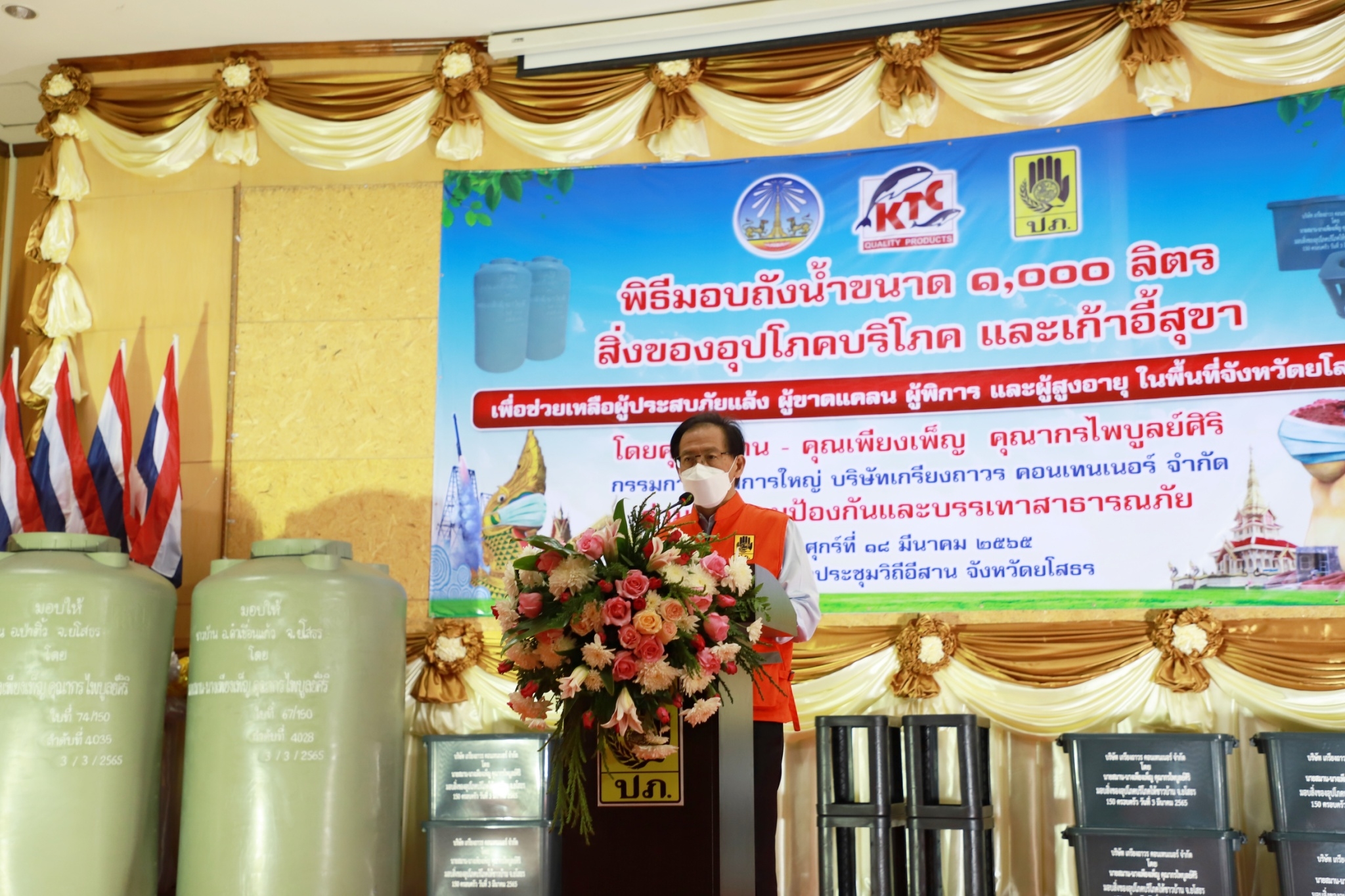 ? โอกาสนี้ นายบุญธรรม เลิศสุขีเกษม อธิบดีกรมป้องกันและบรรเทาสาธารณภัย พร้อมด้วย นายวิบูลย์ สงวนพงศ์, นายสมาน – นางเพียงเพ็ญ คุณากรไพบูลย์ศิริ ผู้บริหารจากบริษัท เกรียงถาวร คอนเทนเนอร์ จำกัด และคณะ ได้เดินทางมามอบสิ่งของบริจาค เพื่อช่วยเหลือประชาชนผู้ประสบภัยแล้ง ผู้ที่ขาดแคลน รวมทั้งผู้พิการ และผู้สูงอายุ ในพื้นที่จังหวัดยโสธร โดยสิ่งของบริจาคประกอบไปด้วย ถังน้ำ ขนาด 1,000 ลิตร จำนวน 150 ใบ บริจาคให้กับหมู่บ้านที่ประสบปัญหาภัยแล้ง กล่องพลาสติกบรรจุสิ่งของอุปโภคบริโภค จำนวน 150 กล่อง ให้กับผู้ขาดแคลน และเก้าอี้สุขาพลาสติก จำนวน 150 ตัว สำหรับผู้พิการ และผู้สูงอายุ โดยจังหวัดยโสธรได้ดำเนินการจัดสรรและมอบให้แก่อำเภอทั้ง 9 อำเภอ เพื่อนำไปใช้ในการช่วยเหลือและบรรเทาความเดือดร้อนของประชาชน โดยมีเป้าหมายสำคัญ คือให้ประชาชนในพื้นที่เสี่ยงขาดแคลนน้ำอุปโภคบริโภค ให้มีน้ำสำรองไว้ใช้อย่างทั่วถึงและเป็นธรรม รวมถึงผู้สูงอายุและผู้พิการ สามารถใช้ชีวิตได้อย่างมีคุณภาพ