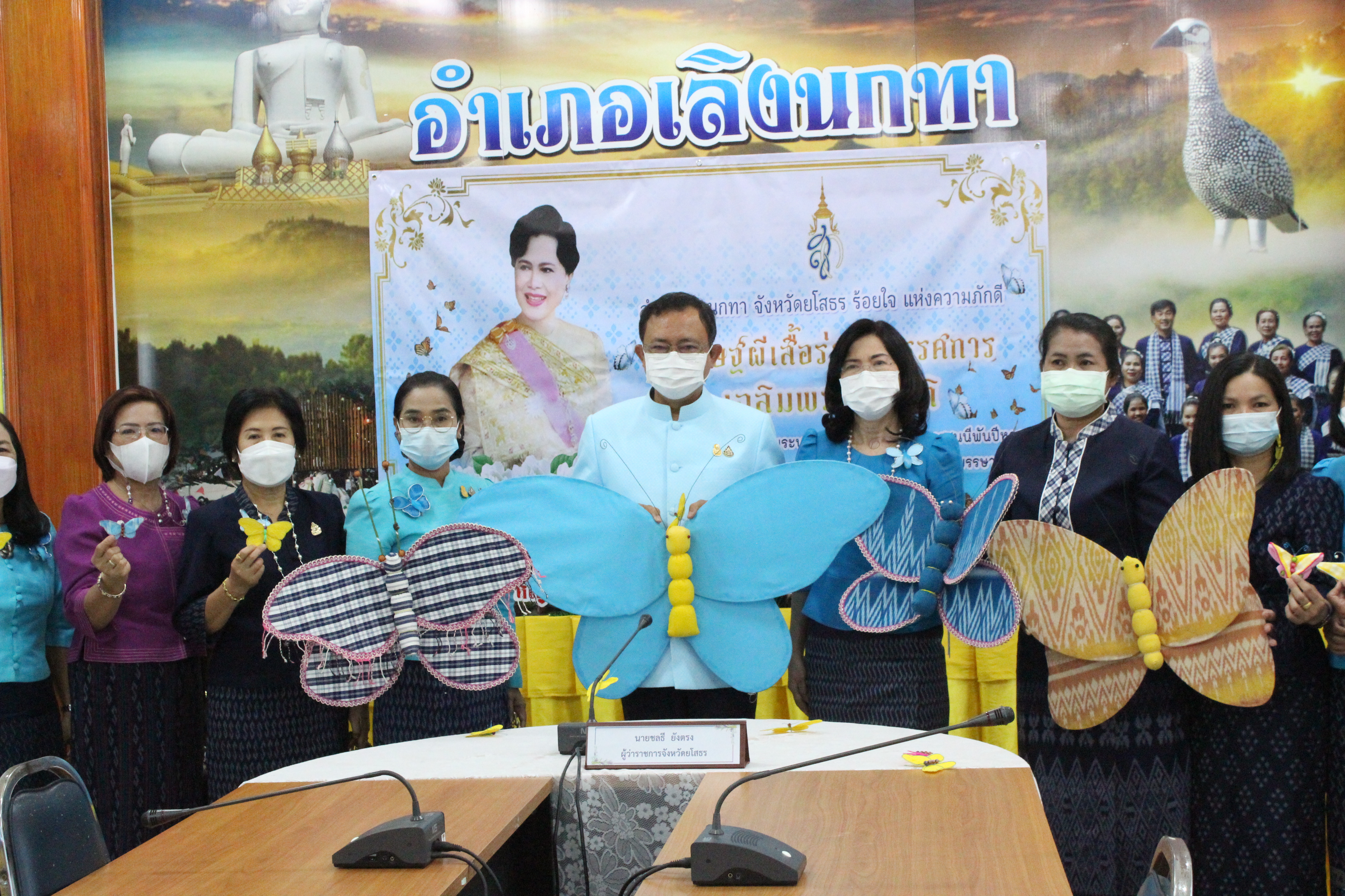 ? นายชลธี ยังตรง ผู้ว่าราชการจังหวัดยโสธร พร้อมด้วย นางพัทธานันท์ ยังตรง นายยกเหล่ากาชาดจังหวัดยโสธร นางวิชชุฎา เข็มเพชร นางรพีพรรณ แสงศรี รองประธานแม่บ้านมหาดไทยจังหวัดยโสธร นางสาวพุทธิมาลย์ เชียรพิมาย พัฒนาการจังหวัดยโสธร สมาชิกชมรมแม่บ้านมหาดไทย ลงพื้นที่ตรวจเยี่ยมให้กำลังใจแก่กลุ่มในการประดิษฐ์ผีเสื้อเพื่อนำไปประดับในนิทรรศการเฉลิมพระเกียรติสมเด็จพระนางเจ้าสิริกิติ์ พระบรมราชินีนาถ พระบรมราชชนนีพันปีหลวง เนื่องในโอกาสมหามงคลเฉลิมพระชนมพรรษา ๙๐ พรรษา ๑๒ สิงหาคม ๒๕๖๕ เพื่อประชาสัมพันธ์เชิญชวนส่วนราชการ หน่วยงานรัฐวิสาหกิจ องค์กรปกครองส่วนท้องถิ่น ภาคเอกชน ภาคประชาชนในจังหวัด และกลุ่มผู้ผลิตสินค้า OTOP ดำเนินการประดิษฐ์ผีเสื้อ โดยใช้ผ้าไหม ผ้าฝ้าย หรือผ้าตามอัตลักษณ์ และในการประดิษฐ์ผีเสื้อต้นแบบในวันนี้ ซึ่งอำเภอเลิงนกทา ได้นำผ้าลายอัตลักษณ์ “ลายตาม่องผ้าลายตาม่อง ภูไทห้องแซง” มาประดิษฐ์ผีเสื้อจำนวน 90 ตัว ซึ่งมีขนาดและสีสันสวยงามแตกต่างกันไป นำมาประดิษฐ์ผีเสื้อที่มีความสวยงามและมีเอกลักษณ์ของจังหวัดยโสธร เพื่อเป็นสัญลักษณ์แทนความจงรักภักดีและสำนึกในพระมหากรุณาธิคุณ ของพสกนิกรชาวจังหวัดยโสธร