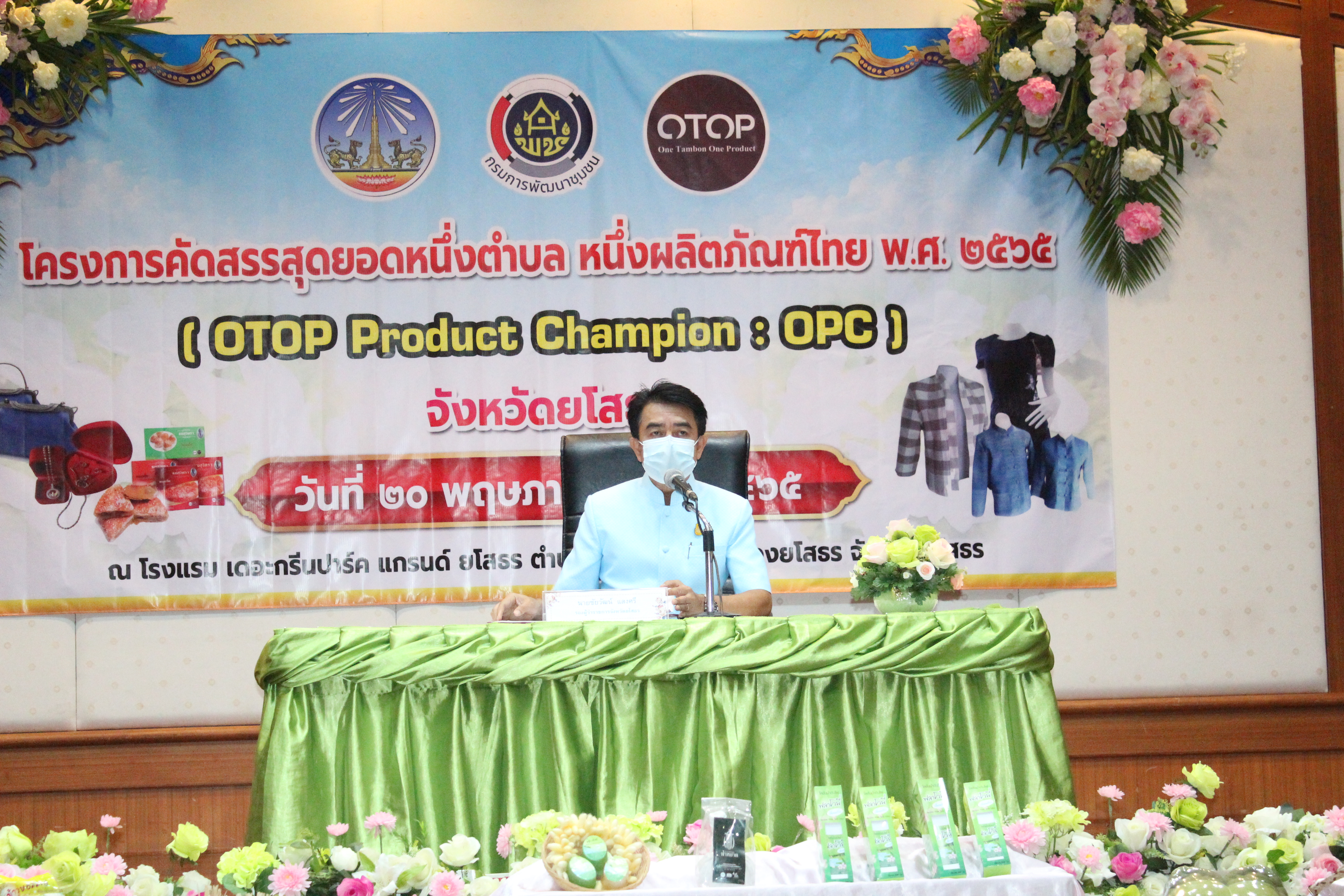 ?   จังหวัดยโสธร โดยสำนักงานพัฒนาชุมชนจังหวัดยโสธร ได้จัดโครงการคัดสรรสุดยอดหนึ่งตำบล หนึ่งผลิตภัณฑ์ไทย ปี พ.ศ. 2565 ไทย (OTOP Product Champion : OPC) ทั้งนี้ เพื่อจัดระดับผลิตภัณฑ์ไปสู่การพัฒนาระดับประเทศ เพื่อจัดระบบฐานข้อมูล เสริมสร้างคุณค่าของผลิตภัณฑ์ให้เป็นที่ยอมรับแก่บุคคลทั่วไป จนเป็นแหล่งสร้างรายได้และความเข็มแข็งให้กับชุมชนได้ และเป็นการกระตุ้นให้เกิดกระบวนการมีส่วนร่วมของผู้ผลิต ผู้ประกอบการ OTOP และ ชุมชนในการพัฒนาผลิตภัณฑ์ โดยในการคัดสรรในครั้งนี้ เพื่อจัดระดับผลิตภัณฑ์ Product Level ระดับ 1-5 ดาว ที่จะนำไปสู่การพัฒนา (Product Development) ระดับประเทศ และจัดระบบฐานข้อมูลผลิตภัณฑ์ (Profile) ที่จะใช้ในการทำงานเชิงบูรณาการของทุกหน่วยงานที่เกี่ยวข้อง พร้อมทั้งประชาสัมพันธ์และเสริมสร้างคุณค่าของผลิตภัณฑ์ให้เป็นที่ยอมรับแก่บุคคลทั่วไปจนสามารถใช้เป็นแหล่งสร้างรายได้และความเข้มแข็งให้กับชุมชน ตลอดจนกระตุ้นให้เกิดกระบวนการมีส่วนร่วมของผู้ผลิต/ผู้ประกอบการ OTOP และชุมชนในการพัฒนาผลิตภัณฑ์ อีกทั้งเป็นการเปิดโอกาสให้ กลุ่มอาชีพ กลุ่มสัมมาชีพชุมชน ที่ลงทะเบียนเป็นผู้ผลิต ผู้ประกอบการ OTOP ได้เข้าร่วมคัดสรรฯ นำไปสู่การพัฒนาผลิตภัณฑ์ให้มีคุณภาพมาตรฐานมากยิ่งขึ้น