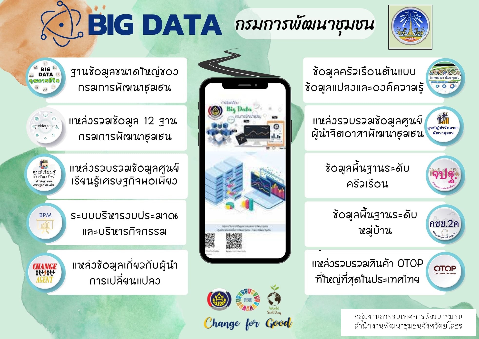 สำนักงานพัฒนาชุมชนจังหวัด ยโสธร ขอเชิญชวนทุกท่านเข้าใช้งานและเผยแพร่ประชาสัมพันธ์ ระบบ Big Data การพัฒนาชุมชนและทำความรู้จักข้อมูล Big data เพื่อเสริมสร้างความรู้ความเข้าใจ ฐานข้อมูล Big data ที่สามารถนำไปใช้ประโยชน์ได้จริง