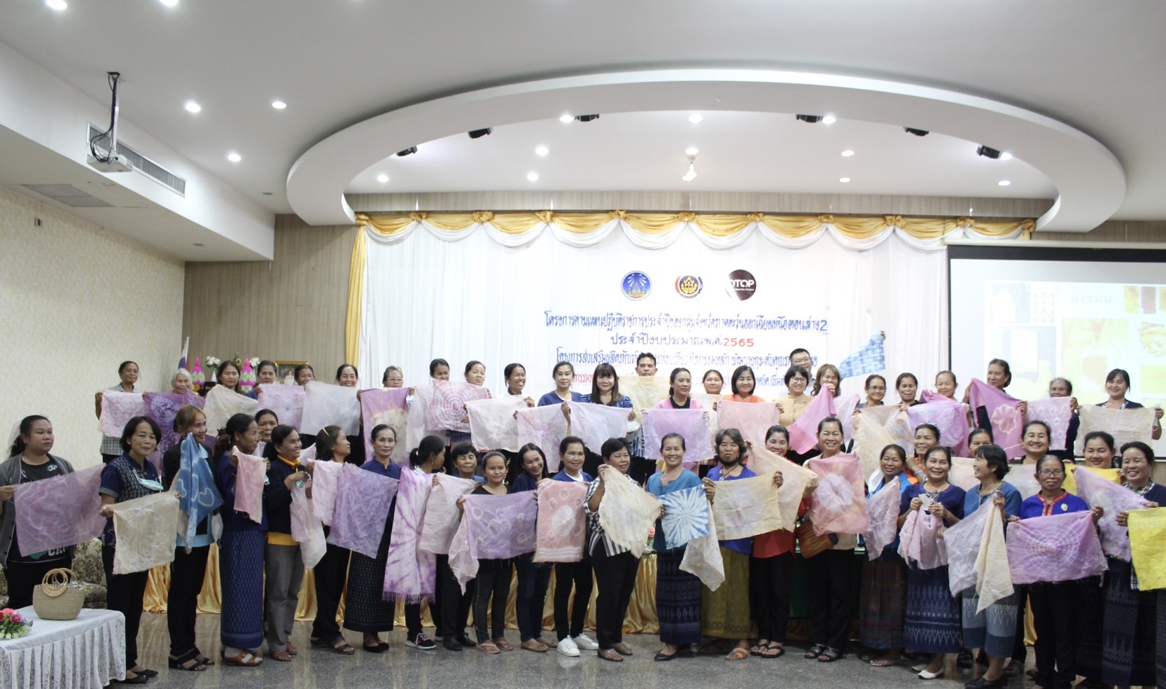 นางทรัพย์สิน โพธิ์ขาว ผู้อำนวยการกลุ่มงานส่งเสริมการพัฒนาชุมชน เจ้าหน้าที่พัฒนาชุมชนจังหวัดยโสธร ร่วมติดตามให้กำลังใจกลุ่มผู้ผลิต ผู้ประกอบการ กลุ่มทอผ้าในการดำเนินโครงการส่งเสริมผลิตภัณฑ์ด้านการท่องเที่ยว กิจกรรมหลักพัฒนายกระดับคุณภาพผ้าทอ โดยกิจกรรมในวันนี้เป็นการให้ความรู้ในการย้อมสีผ้าทอเพื่อเป็นการเพิ่ม มูลค่าให้ผลิตภัณฑ์และภาคบ่ายเป็นการฝึกย้อมสีผ้าต่างๆ เพื่อเป็นการเพิ่มมูลค่าให้กับผ้าอีกทั้งยังเป็นการเพิ่มอัตลักษณ์ของแต่ละชุมชนเข้าไปด้วย โดยเน้นลายที่สร้างสรรค์ ผสมผสานความเป็นภูมิปัญญาชาวบ้าน โดยนางสาวพรภัทร รัตนทองธรรม วิทยากรผู้เชี่ยวชาญในการสอนผ้ามัดย้อม โดยสำนักงานพัฒนาชุมชนจังหวัดยโสธร ได้ประกาศผลการคัดเลือก กลุ่มผู้ผลิต ผู้ประกอบการ OTOP ที่มีศักยภาพและมีความพร้อมที่จะพัฒนาเป็นศูนย์เรียนรู้ด้านภูมิปัญญาผ้าทอพื้นถิ่น จำนวน 9 กลุ่ม