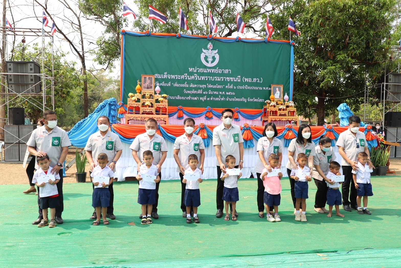 วันที่ 16 มีนาคม 2566 เวลา 09.30 น. นายวิรุจ วิชัยบุญ ผู้ว่าราชการจังหวัดยโสธร พร้อมด้วย พร้อมด้วยนายไกร เอี่ยมจุฬา รองผู้ว่าราชการจังหวัดยโสธร นายบันลือ สัมฤทธิ์จินตนา ปลัดจังหวัดยโสธร นายอำเภอไทยเจริญ สมาชิกเหล่ากาชาดจังหวัดยโสธร ชมรมแม่บ้านมหาดไทยจังหวัดยโสธร หัวหน้าส่วนราชการจังหวัดยโสธร แพทย์ พยาบาล เจ้าหน้าที่สาธารณสุข ส่วนราชการระดับอำเภอ องค์กรปกครองส่วนท้องถิ่น และผู้นำชุมชน ร่วมออกหน่วยแพทย์เคลื่อนที่ พอ.สว. และโครงการจังหวัดเคลื่อนที่ “เพิ่มรอยยิ้ม เติมความสุข ให้คนยโสธร” ครั้งที่ 6 ออกให้บริการประชาชนในท้องถิ่นทุรกันดารห่างไกล ณ โรงเรียนบ้านนาเฮืองนางช้างเฒ่า หมู่ที่ 7 ตำบลน้ำคำ อำเภอไทยเจริญ จังหวัดยโสธร