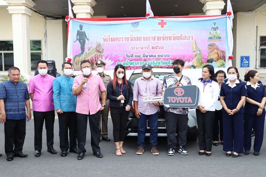 วันที่ 24 มีนาคม 2565 เวลา 14.00 น. ที่บริเวณด้านหน้าศาลากลางจังหวัดยโสธร นายวิรุจ วิชัยบุญ ผู้ว่าราชการจังหวัดยโสธร พร้อมด้วย นางชลาทิพย์ วิชัยบุญ นายกเหล่ากาชาดจังหวัดยโสธร ประธานแม่บ้านมหาดไทยจังหวัดยโสธร นายสุวัฒน์ เข็มเพชร รองผู้ว่าราชการจังหวัดยโสธร นางวิชชุฎา เข็มเพชร รองนายกเหล่ากาชาดจังหวัดยโสธร นายบันลือ สัมฤทธิ์จินตนา ปลัดจังหวัดยโสธร หัวหน้าส่วนราชการ ข้าราชการ เจ้าหน้าที่ คณะกรรมการเหล่ากาชาดจังหวัดยโสธร และสมาชิกชมรมแม่บ้านมหาดไทยจังหวัดยโสธร ได้ร่วมส่งมอบรางวัลรถยนต์ ทองคำแท่ง และรถจักรยานยนต์แก่ประชาชนผู้โชคดี ที่ซื้อสลากกาชาดและถูกรางวัลสลากกาชาดจังหวัดยโสธร ในงานสถาปนาจังหวัดยโสธร ครบรอบ 51 ปี และงานกาชาด ประจำปี 2566