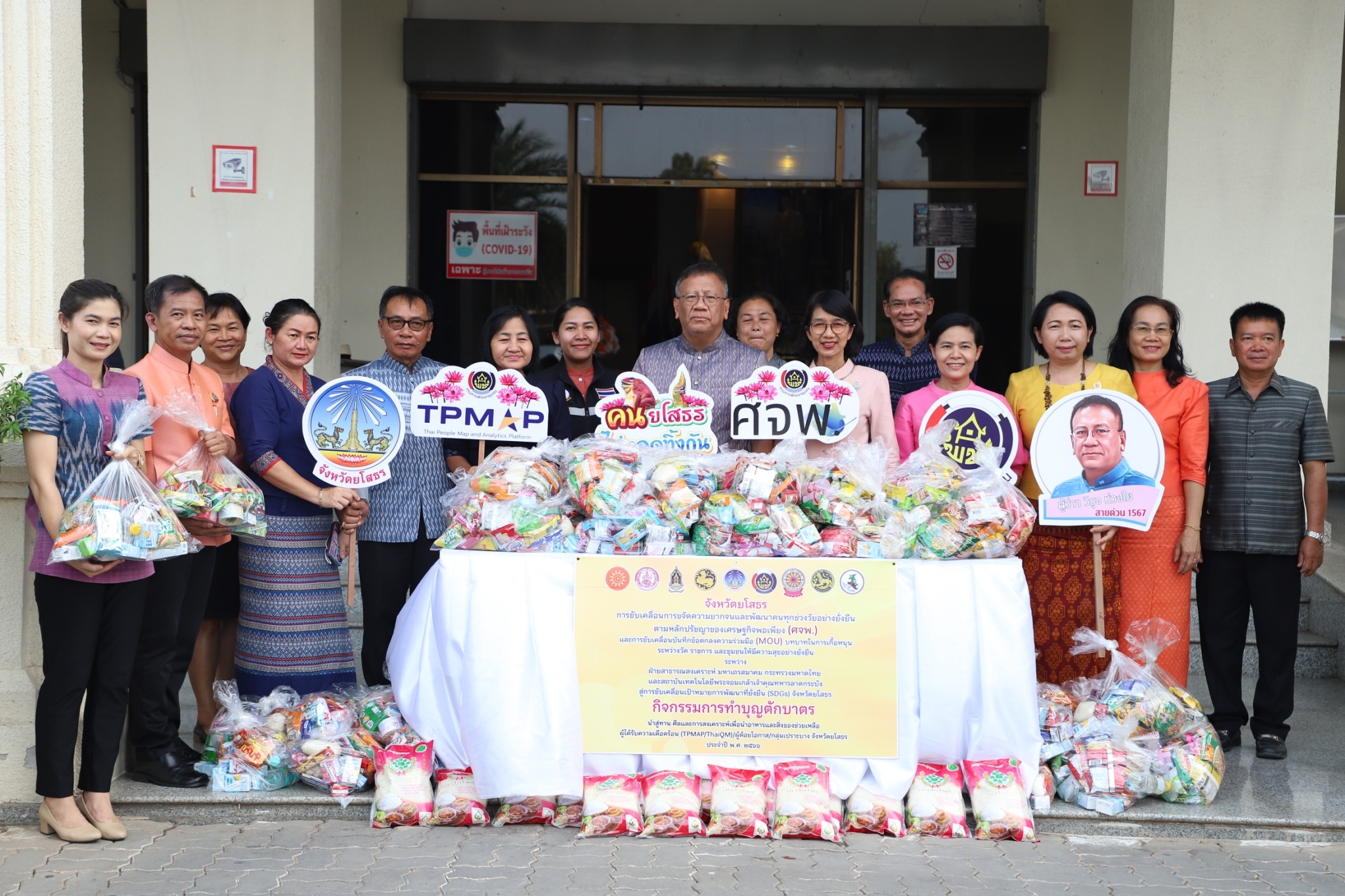 ?พ่อเมืองยโสธร ส่งมอบอาหารและสิ่งของช่วยเหลือ ผู้ได้รับความเดือดร้อน (TPMAP/ThaiQM) ผู้ด้อยโอกาส/กลุ่มเปราะบาง ประจำปี พ.ศ.2566 ภายใต้การขับเคลื่อนการขจัดความยากจนและพัฒนาคนทุกช่วงวัยอย่างยั่งยืนตามหลักปรัชญาของเศรษฐกิจพอเพียง (ศจพ.) และการขับเคลื่อนบันทึกข้อตกลงความร่วมมือ (MOU) บทบาทในการเกื้อหนุนระหว่างวัด ราชการ และชุมชนให้มีความสุขอย่างยั่งยืน ระหว่างฝ่ายสาธารณสงเคราะห์ มหาเถรสมาคม กระทรวงมหาดไทยและสถาบันเทคโนโลยีพระจอมเกล้าเจ้าคุณทหารลาดกระบัง สู่การขับเคลื่อนเป้าหมายการพัฒนาที่ยั่งยืน (SDGs) จังหวัดยโสธร