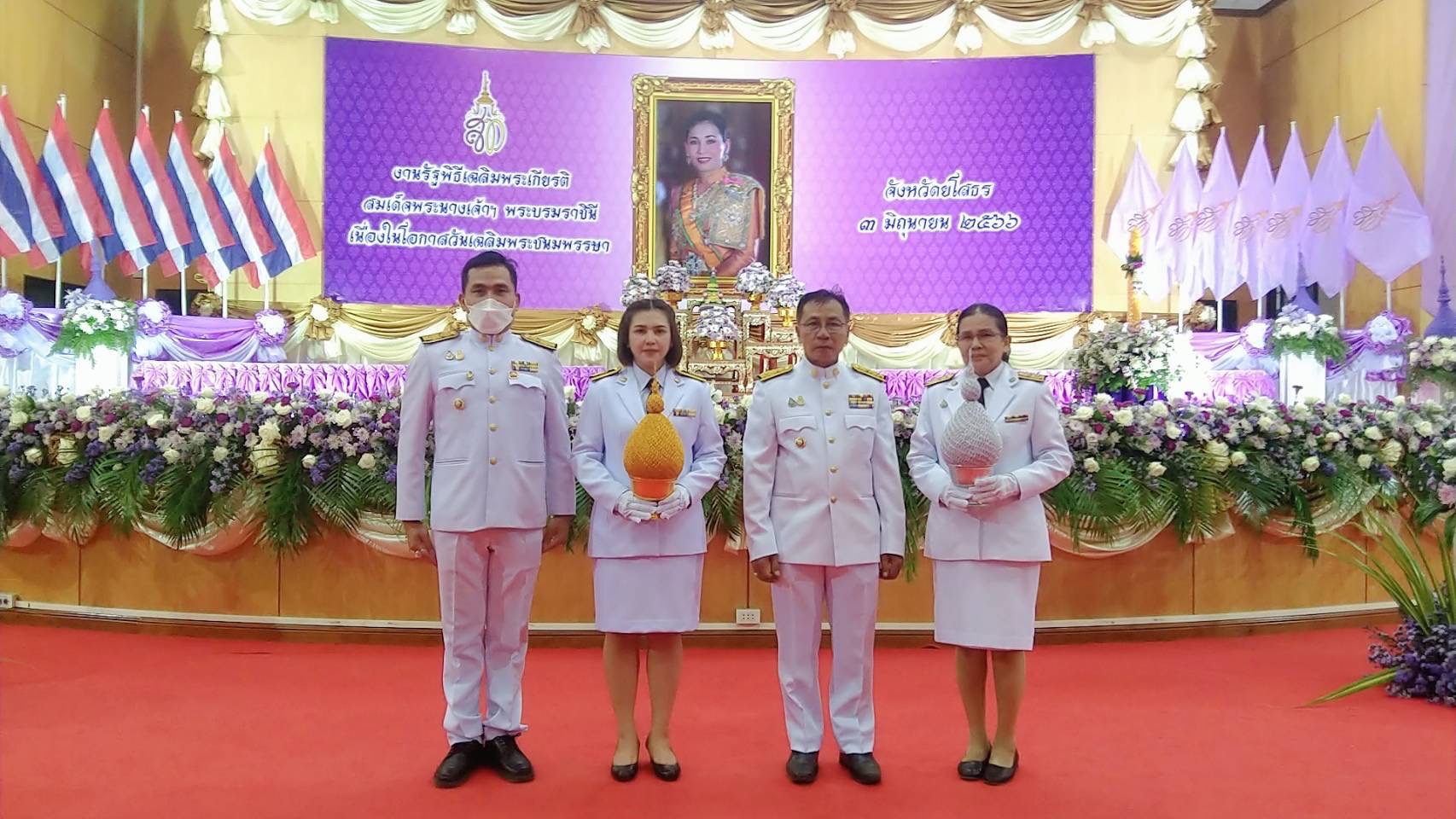 นายวิรุจ วิชัยบุญ ผู้ว่าราชการจังหวัดยโสธร พร้อมด้วย นางชลาทิพย์ วิชัยบุญ นายกเหล่ากาชาดจังหวัดยโสธร นายสุวัฒน์ รองผู้ว่าราชการจังหวัดยโสธร นายไกร เอี่ยมจุฬา รองผู้ว่าราชการจังหวัดยโสธร และหัวหน้าส่วนราชการ ข้าราชการพลเรือน ตุลาการ อัยการ ทหาร ตำรวจ สมาชิกเหล่ากาชาดจังหวัดยโสธร ร่วมพิธีถวายเครื่องราชสักการะ วางพานพุ่มเงิน-พุ่มทอง กล่าวถวายราชสดุดี และจุดเทียนชัยถวายพระพรชัยมงคล เบื้องหน้าพระฉายาลักษณ์ สมเด็จพระนางเจ้าสุทิดา พัชรสุธาพิมลลักษณ พระบรมราชินี เนื่องในโอกาสวันเฉลิมพระชนมพรรษา 3 มิถุนายน ที่หอประชุมวิถีอีสาน ศาลากลางจังหวัดยโสธร