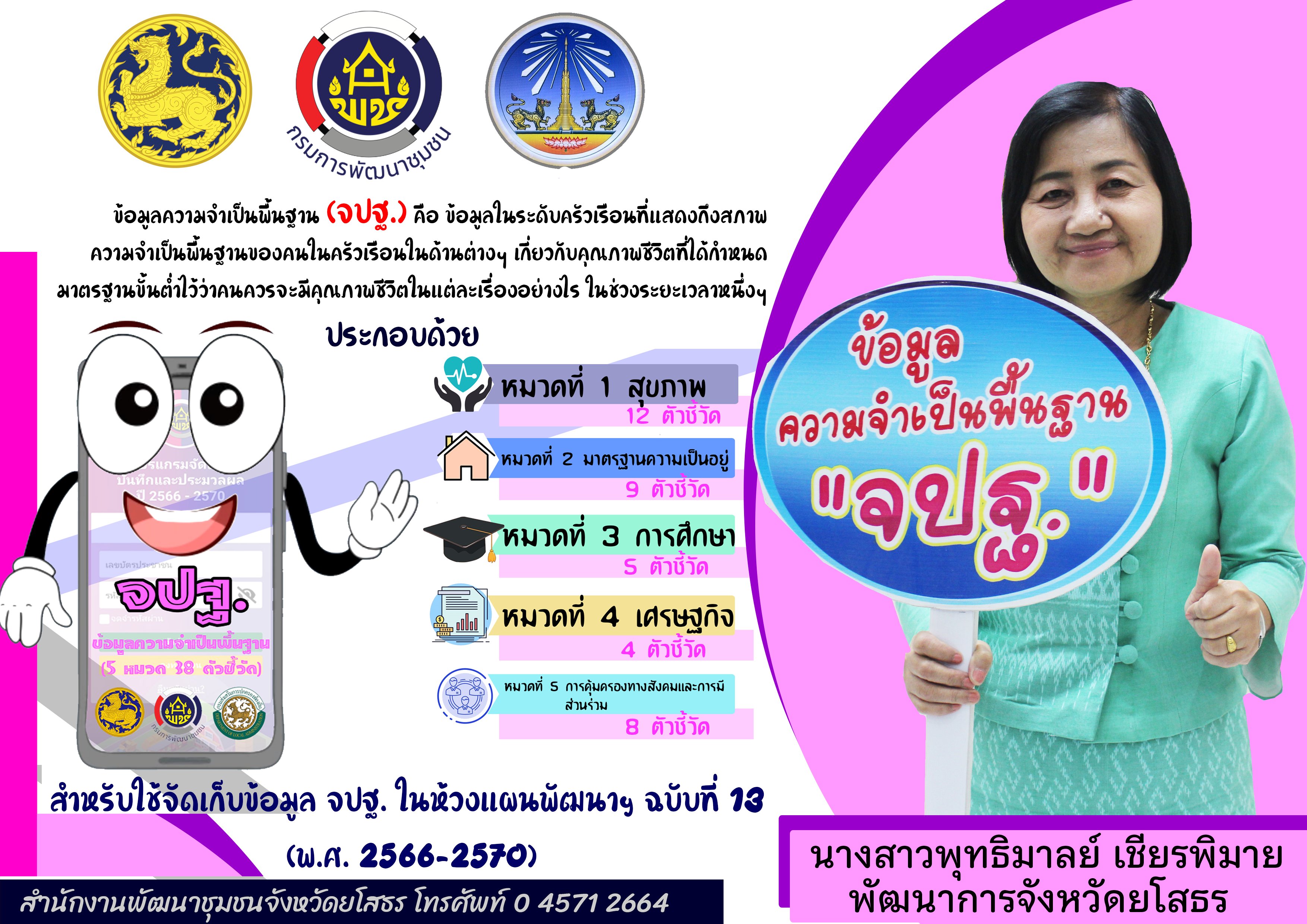 (notepad) กระทรวงมหาดไทยได้ มอบหมายให้กรมการพัฒนาชุมชนรับผิดชอบการบริหารการจัดเก็บข้อมูลความจำเป็นพื้นฐาน (จปฐ.) เป็นประจำทุกปี และข้อมูลพื้นฐานระดับหมู่บ้าน (กชช.2ค) ทุกสองปี โดยการบริหารการจัดเก็บข้อมูลฯ ปี 2564 เป็นต้นมา ได้ดำเนินการจัดเก็บข้อมูลด้วยเครื่องมืออิเล็กทรอนิกส์ เพื่อเป็นการลดขั้นตอนและลดระยะเวลาในการจัดเก็บข้อมูล ตอบสนองนโยบายรัฐบาลในการขับเคลื่อนเศรษฐกิจและสังคมของประเทศสู่ความมั่นคง มั่งคั่ง และยั่งยืนด้วยเทคโนโลยีดิจิทัล และได้ปรับปรุงเครื่องชี้วัดข้อมูล จปฐ. จำนวน 5 หมวด 38 ตัวชี้วัด เพื่อให้สอดคล้องสำหรับใช้ในช่วงแผนพัฒนาเศรษฐกิจและสังคมแห่งชาติ ฉบับที่ 13 (พ.ศ.2566 – 2570)