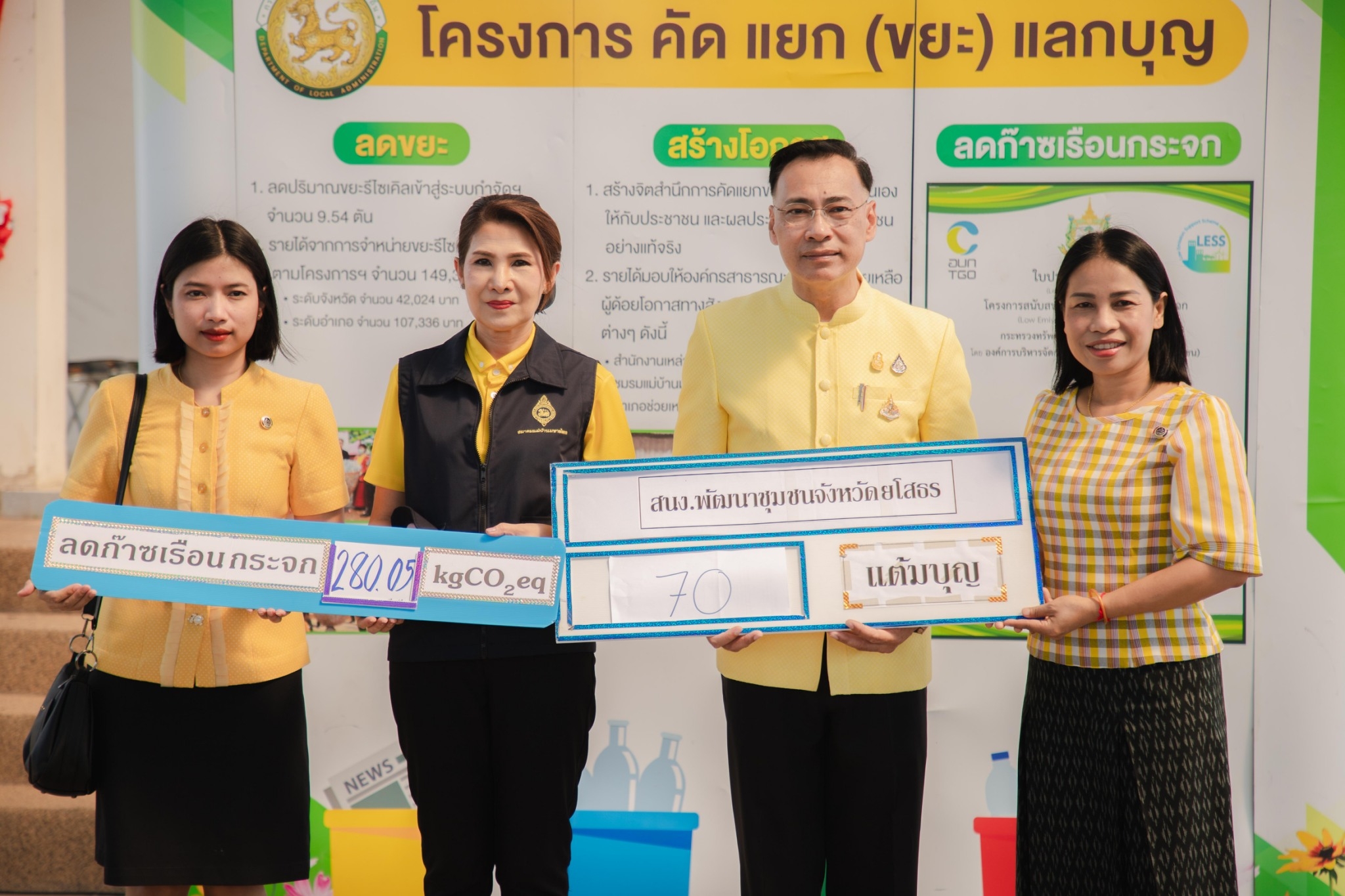 พช.ยโสธร ร่วมขับเคลื่อนจังหวัดสะอาดอย่างยั่งยืน รวมพลัง คัดแยก (ขยะ) แลกบุญ ลดปัญหาขยะ ลดก๊าซเรือนกระจก และยังได้ร่วมทำบุญสาธารณกุศลด้วย