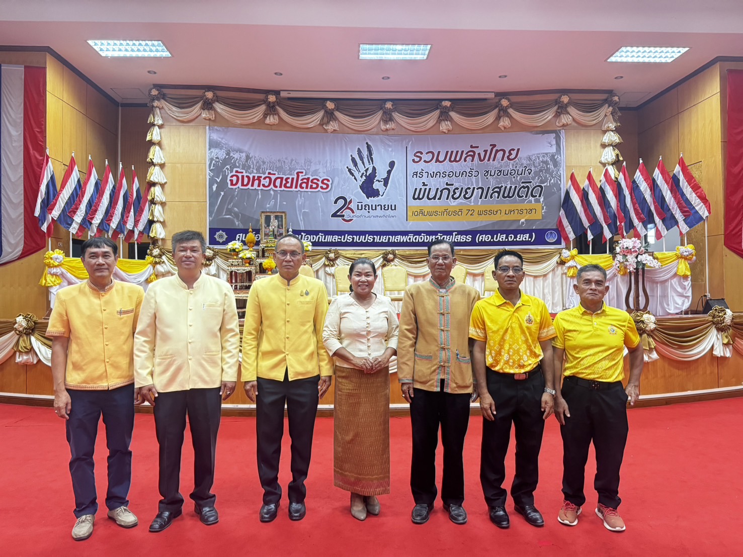 ในการนี้ นายบรรลือ พลับพลึง พัฒนาการจังหวัดยโสธร มอบหมาย นายสุรชัย แดนพิบูลย์ ผู้อำนวยการกลุ่มงานสารสนเทศการพัฒนาชุมชน พร้อมด้วยหัวหน้าส่วนราชการจังหวัด คณะกรรมการศูนย์อำนวยการป้องกันและปราบปรามยาเสพติดระดับจังหวัด (ศอ.ปส.จ.) คณะทำงานการป้องกันและปราบปรามยาเสพติด เจ้าหน้าที่พัฒนาชุมชนจังหวัด/อำเภอ เครือข่ายกองทุนแม่ของแผ่นดิน หน่วยงานภาคีภาครัฐและภาคเอกชน จำนวน 100 คน เข้าร่วมกิจกรรมดังกล่าว ซึ่งงานมหกรรมในวันนี้ เป็นการบูรณาการความร่วมมือศูนย์อำนวยการป้องกันและปราบปรามยาเสพติดจังหวัดยโสธร ร่วมกับสำนักงานพัฒนาชุมชนจังหวัดยโสธรในการจัดงานมหกรรมวันต่อต้านยาเสพติดโลก (26 มิถุนายน) ประจำปี 2567 โดยมีวัตถุประสงค์เพื่อสร้างการรับรู้และเห็นถึงความสำคัญของวันต่อต้านยาเสพติดโลก (26 มิถุนายน) ตระหนักถึงภัยจากยาเสพติด เฝ้าระวัง เสริมสร้างพื้นที่/กิจกรรมเชิงบวก รวมทั้งมีส่วนร่วมในการป้องกันและแก้ไขปัญหายาเสพติดอย่างจริงจังและต่อเนื่อง อีกทั้งสร้างกระแสความตื่นตัว กระตุ้น ชักชวน จูงใจให้ผู้เสพ/ผู้ติดยาเสพติดเข้าสู่การบำบัดรักษา และสามารถป้องกันตนเอง ครอบครัว สังคม ตลอดจนประเทศชาติให้ปลอดภัยจากยาเสพติด และสำนึกในพระมหากรุณาธิคุณของพระบาทสมเด็จพระเจ้าอยู่หัวตลอดจนร่วมกันแสดงพลังความสามัคคีและทำความดี ถวายพระบาทสมเด็จพระเจ้าอยู่หัว เนื่องในโอกาสมหามงคลพระบาทสมเด็จพระเจ้าอยู่หัว เฉลิมพระชนมพรรษา 6 รอบ 28 กรกฎาคม 2567