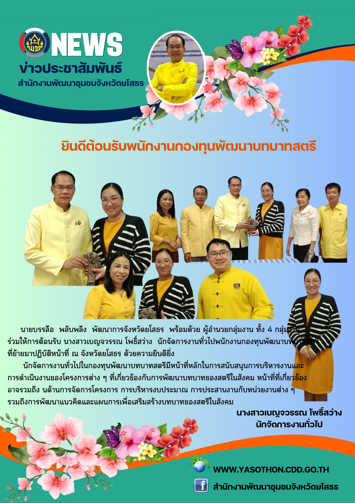 ⭐ นายบรรลือ พลับพลึง พัฒนาการจังหวัดยโสธร พร้อมด้วย ผู้อำนวยกลุ่มงาน ทั้ง 4 กลุ่มงาน ร่วมให้การต้อนรับ นางสาวเบญจวรรณ โพธิ์สว่าง นักจัดการงานทั่วไปพนักงานกองทุนพัฒนาบทบาทสตรี ที่ย้ายมาปฏิบัติหน้าที่ ณ จังหวัดยโสธร ด้วยความยินดียิ่ง