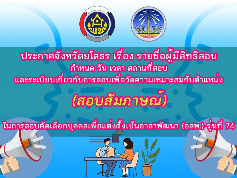 จังหวัดยโสธร ขอแจ้งประกาศจังหวัดยโสธร เรื่อง รายชื่อผู้มีสิทธิสอบ กำหนดวัน เวลา สถานที่สอบ และระเบียบเกี่ยวกับการสอบเพื่อวัดความเหมาะสมกับตำแหน่ง (สอบสัมภาษณ์) ในการสอบคัดเลือกบุคคลเพื่อแต่งตั้งเป็นอาสาพัฒนา (อสพ.) รุ่นที่ 74 จังหวัดยโสธร