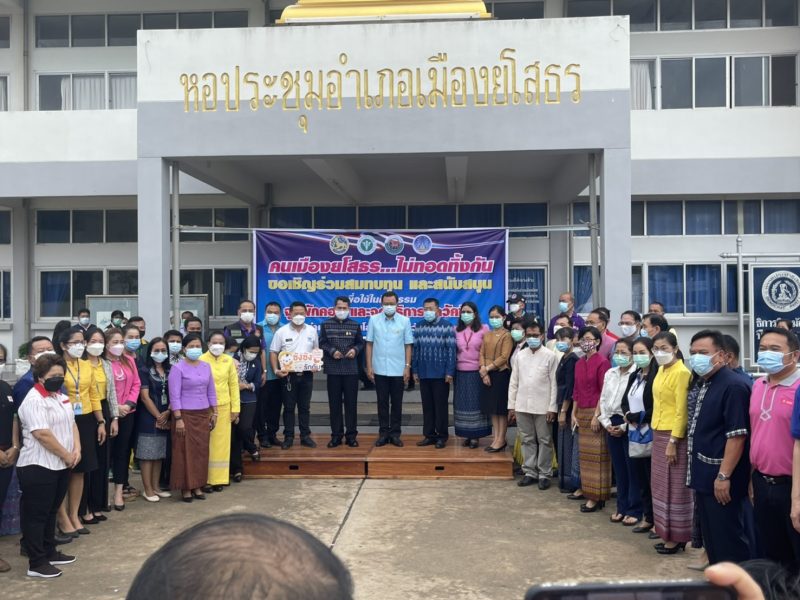 พช.ยโสธรร่วมกับเครือข่าย กทบ. จังหวัดไม่ทิ้งใครไว้ข้างหลัง แบ่งปันน้ำใจ มอบน้ำดื่มให้จุดบริการฉีดวัคซีนป้องกันโควิด-19